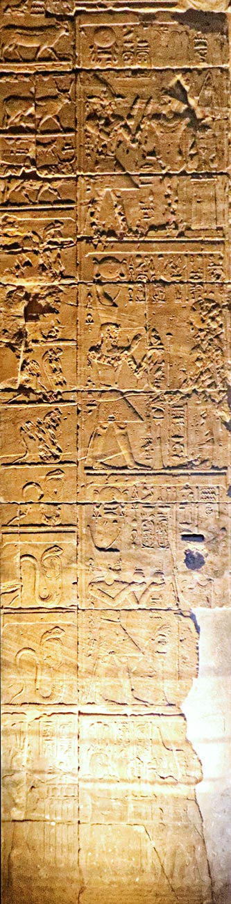 A gauche, en une colonne, les 7 vaches sacrées, le taureau "kakaouthahemout" et 7 cobras dressés.