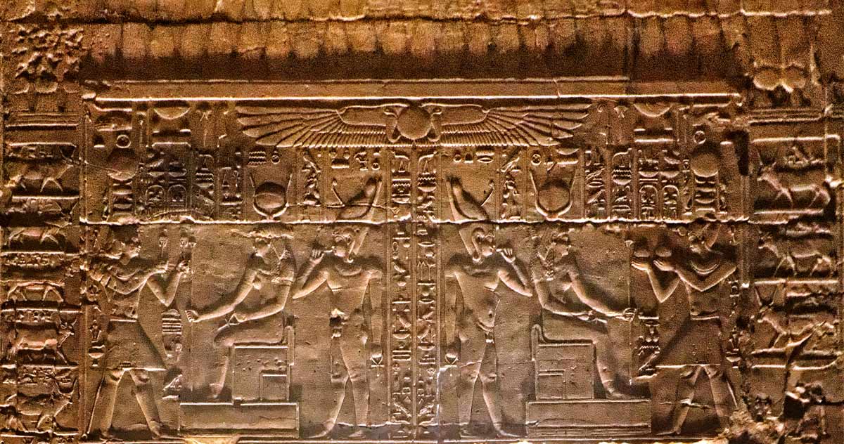 Behedet veille sur les 2 scènes. Ptolémée II Philadelphe debout agite des sistres devant Isis et Harpocrate. Le jeune dieu porte la mèche de l'enfance et met son doigt dans la bouche.