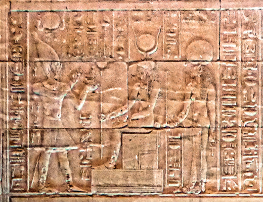 Le roi Ptolémée II joue du sistre pour Isis et Hathor.