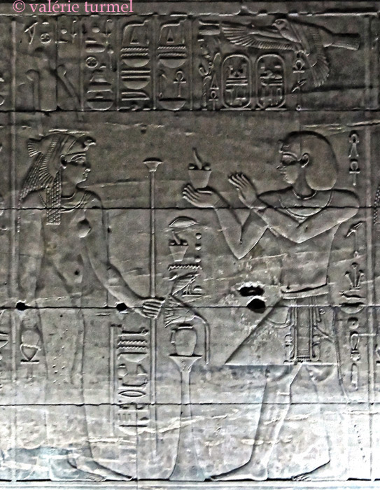Le roi Ptolémée II encense Nekhbet. La déesse lui donne toute vie et pouvoir (ouas), ainsi que toutes les terres. en offrande. Elle promet aussi toute la bravoure contre les terres étrangéres.
