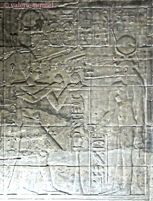 Le roi Ptolémée II offre un miroir à Anoukis..La déesse lui donne toutes les terres et les 2 yeux d'Horus.