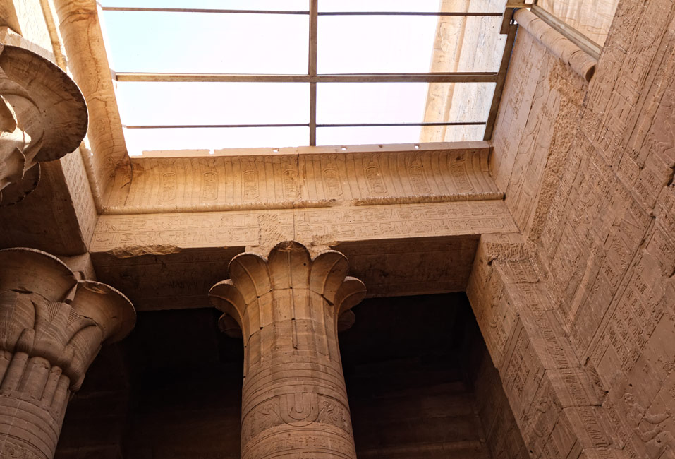 Ptoléme VI conduisit un programme de construction assez conséquent avec notamment les deux pylônes et le pronaos qui faisait la jonction avec le naos construit par Ptolémée II.