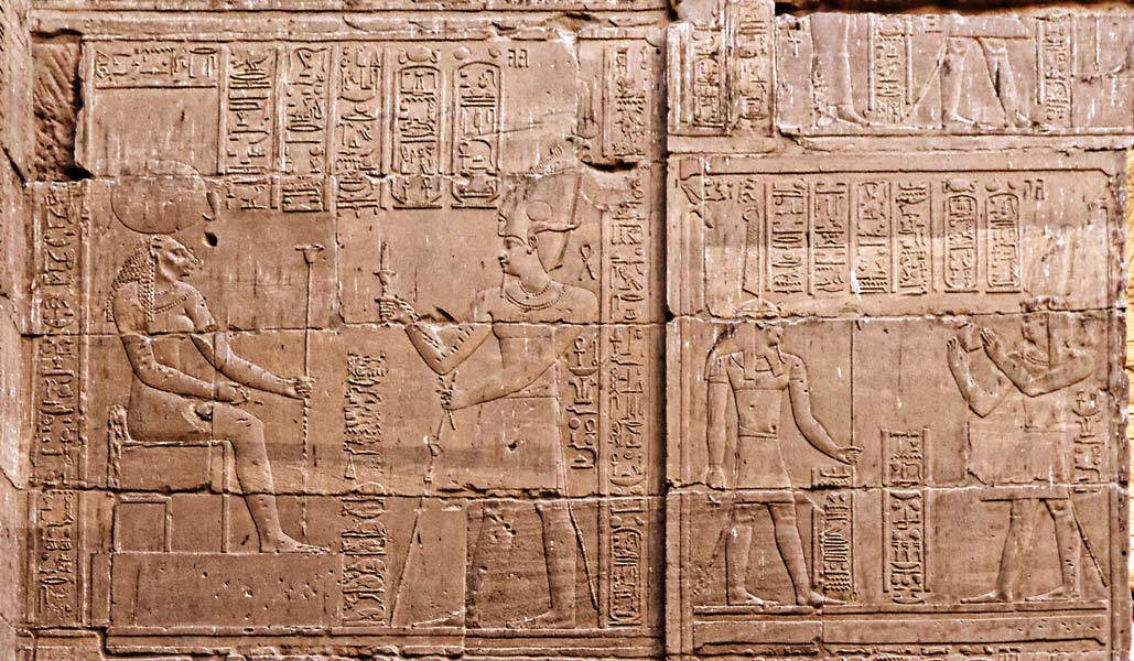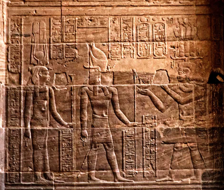 Le roi Ptolémée VIII offre les yeux Oudjat à Horus et Hathor