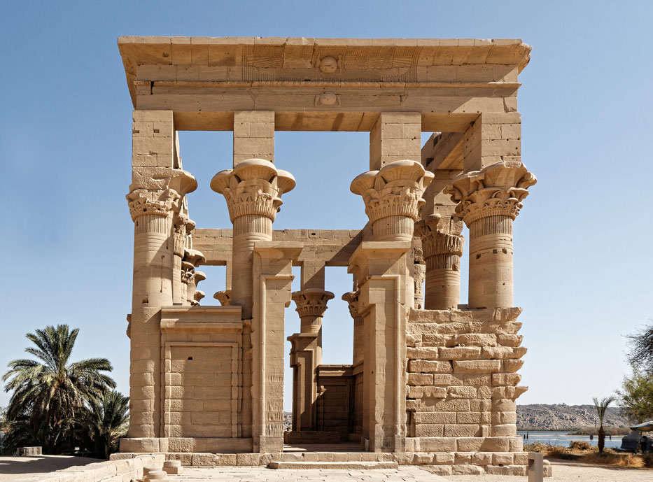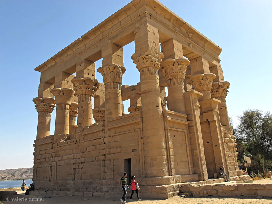 Le kiosque de Trajan est un élégant et majestueux édifice, souvent utilisé pour représenter Philae. Il fut construit par l'empereur Trajan qui y a inscrit ses cartouches dans les deux tableaux qui se trouvent sur des mur-bahut interne. Quatorze colonnes ornées de splendides chapiteaux sont reliées par des murs-bahuts (ou murs d'entrecolonnement).Deux portes d'accès, une à l'ouest et l'autre à l'est ont été aménagées.