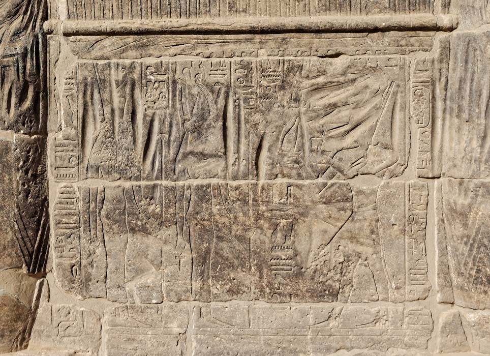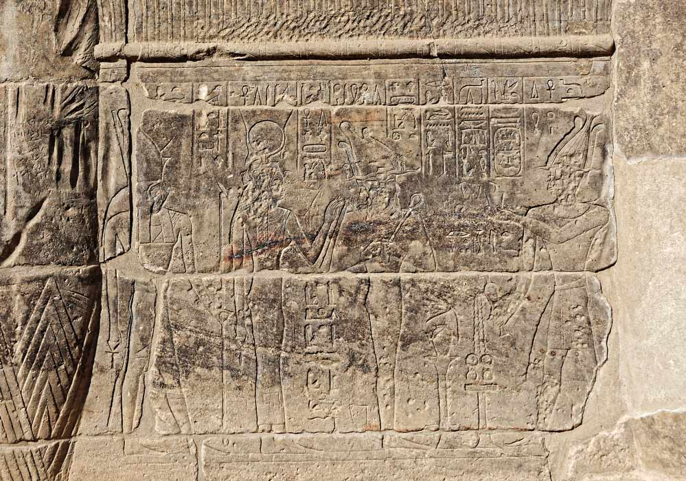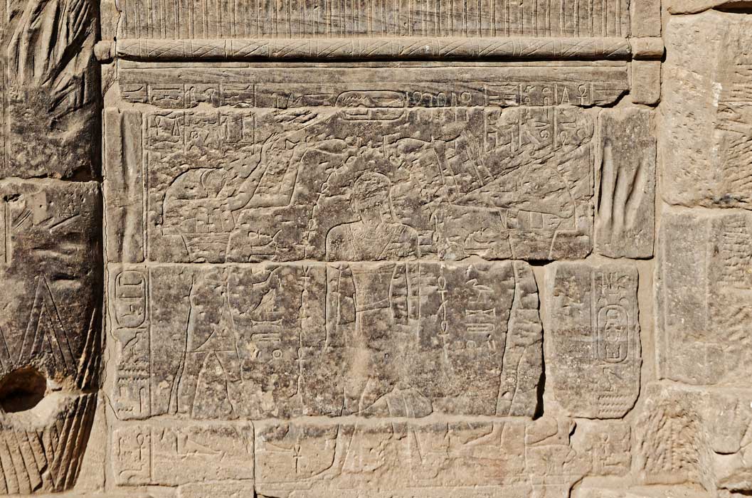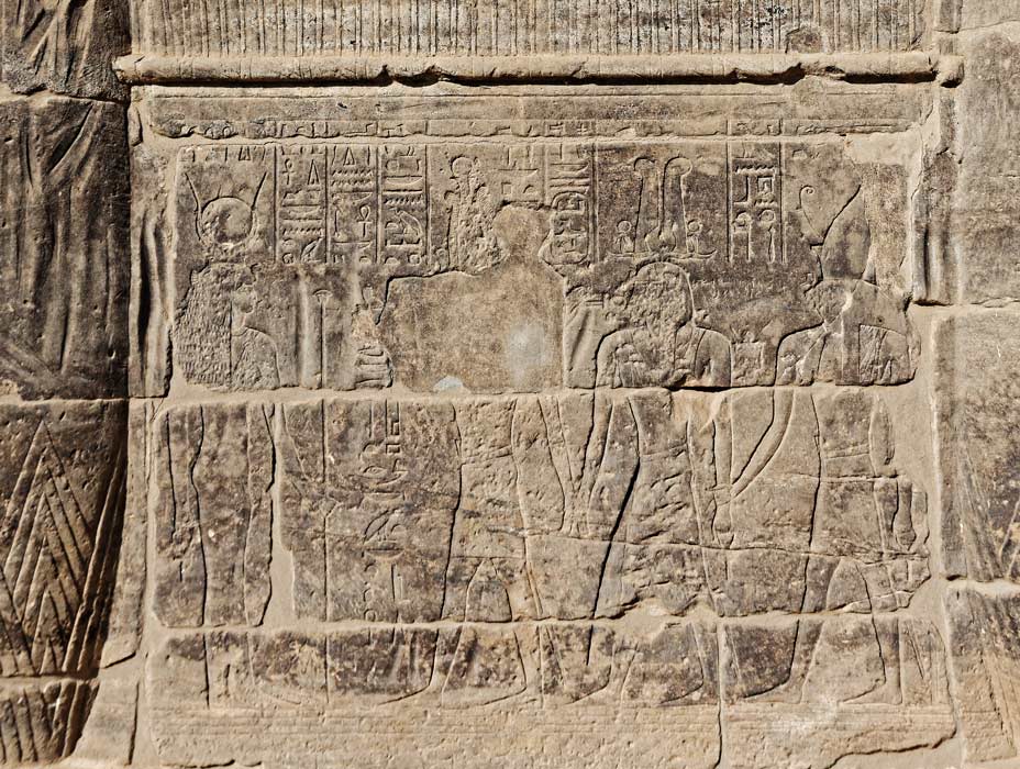 Le roi Nectanebo Ier est purifié par Horus et Thot. Au dessus de la scène et à gauche, le nom du fils de Rê du roi est donné dans le cartouche : <Nkhat-neb-f>, son maître est fort.