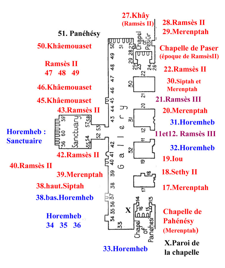 J'ai reproduit le plan donné dans Porter et Moss en indiquant sous quel roi ou quel personnage chaque scène avait été dessinée.