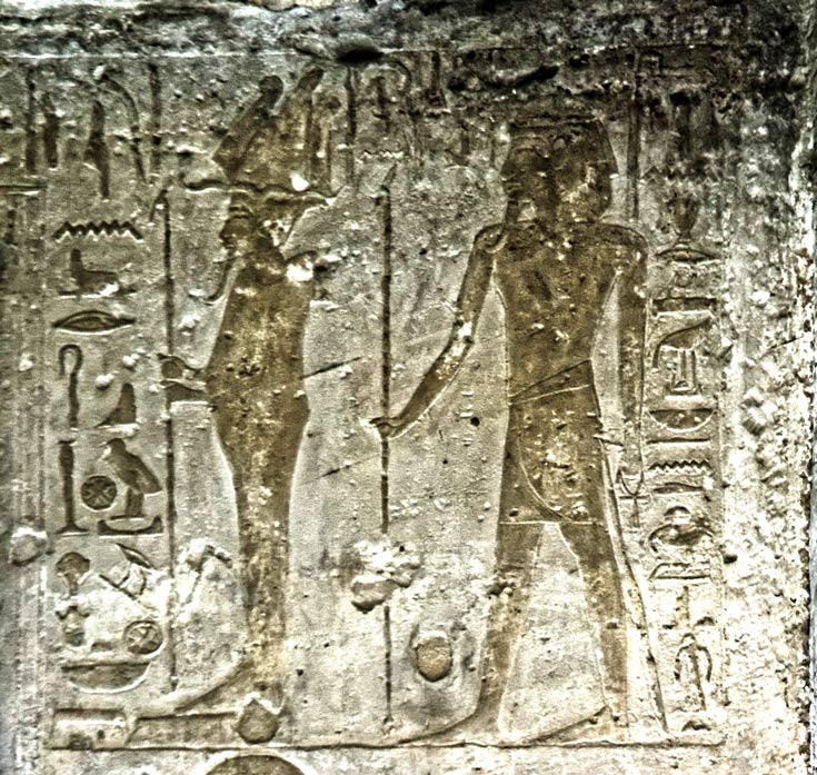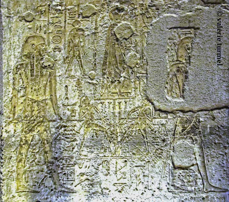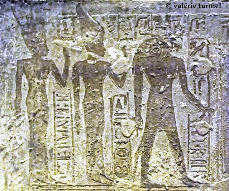 En haut, à gauche, au revers de la porte, paroi Est, Khnoum, Satis et Anoukis.