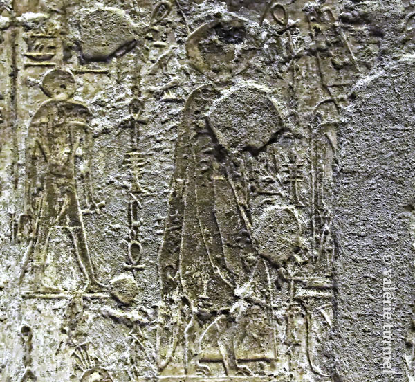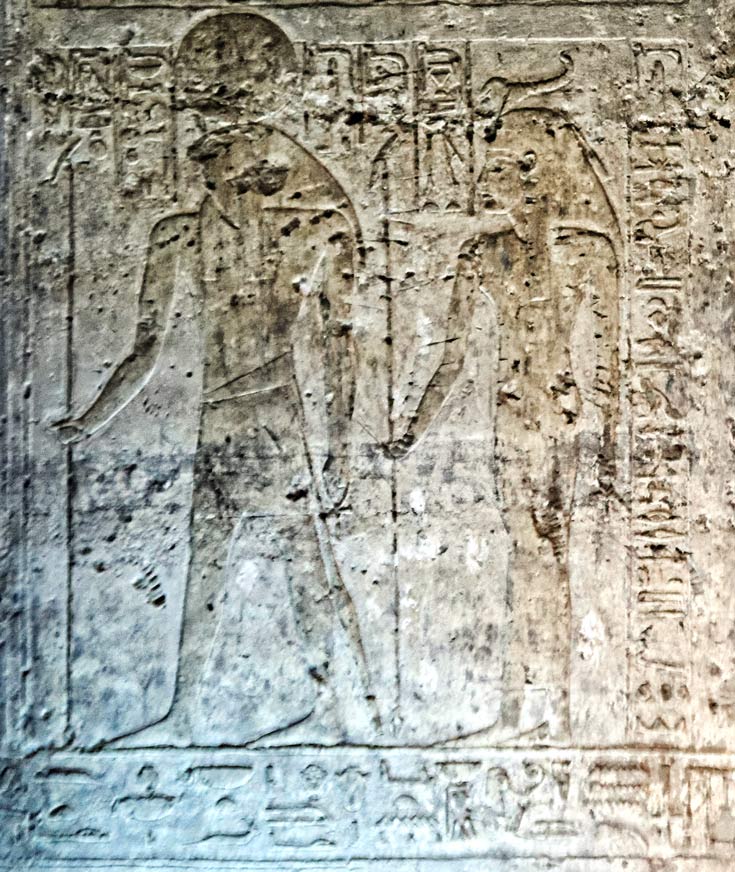 En bas, à gauche, au revers de la porte, paroi Est, deux dieux Hâpy tansportent un sema-taouy avec une déesse hippopotame. La déesse est entourée de signes djed et ankh. Devant elle, le dieu Amon dont il reste surtout la coiffure et derrière elle, le dieu Thot.