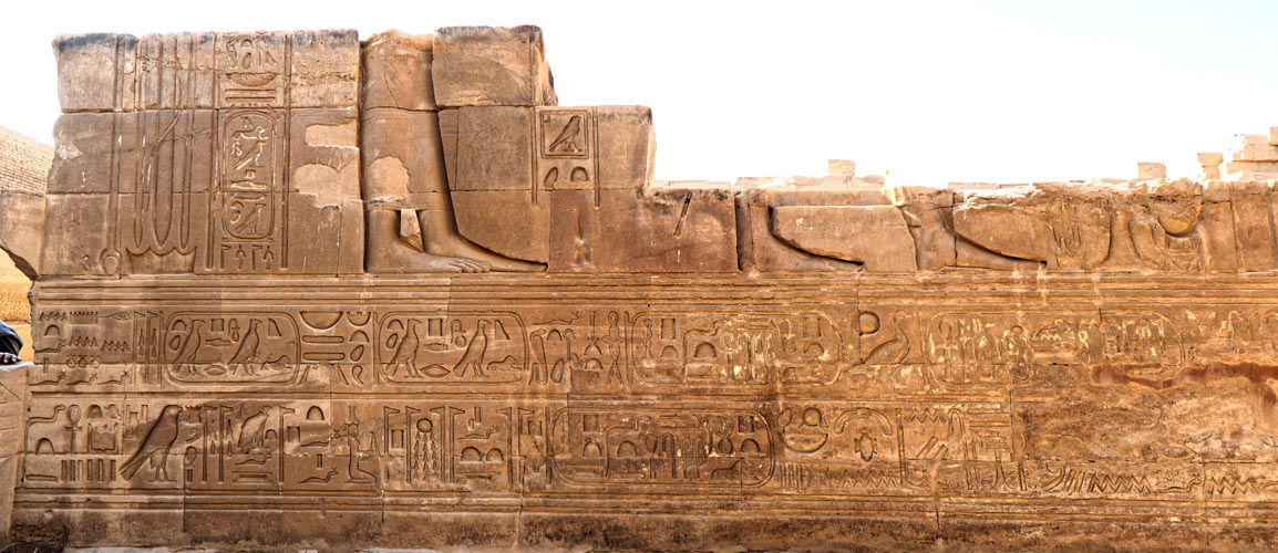 Sur le mur maintenant en grande partie détruit, le roi Ptolémée VIII fit graver 2 scènes avec de grands personnages dont il ne reste plus que les pieds sur la partie Sud. la partie Nord a disparu. Ces scènes étaient destinés à tous ceux qui ne pouvaient pas entrer dans le temple. Ils pouvaient ainsi rendre hommage aux dieux.