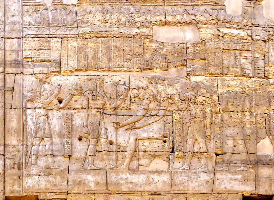 Le roi n'est présent dans cette scène que par les cartouches de Trajan gravés derrière la plume de Chou. Doit-il être assimilé au dieu?