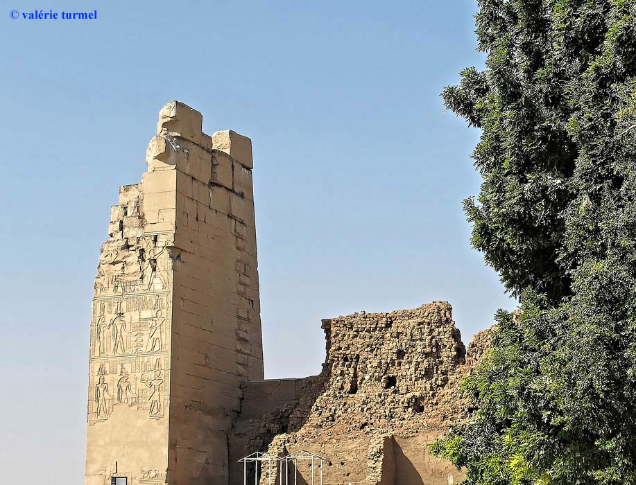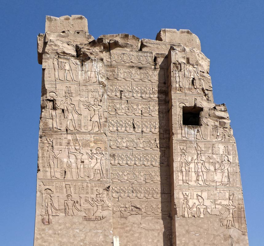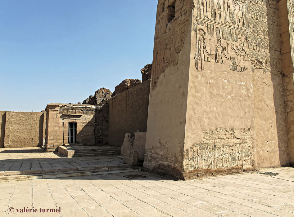 Au milieu, une décoration fait alterner une ligne de signes Ankh entourés de signes Ouas et une ligne de titulatures et de rois. A droite, les restes de scènes montrent le roi Ptolémée XII Neos Dionysos (dit Aulète, le joueur de flûte) et Harsiésis , Hotus fils d'Isis, en haut; puis Shou et Tefnout. En dessous le roi offre des bouquets à Geb et Nout. Enfin il encense Osiris et isis, encadrant un petit Horus, en leur offrant