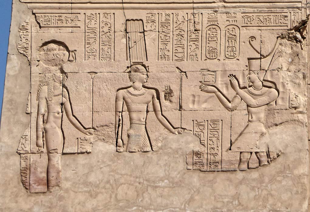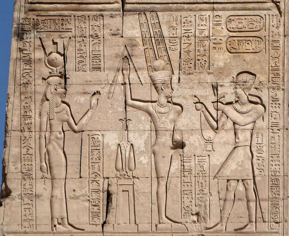 Le roi Ptolémée Néos Dionysos offre un collier au dieu Min accompagné d'Isis. Derrière le dieu, son temple et ses salades.