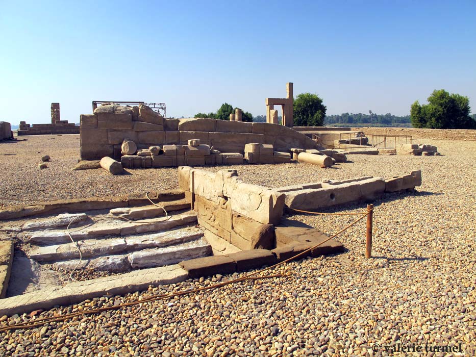 Du côté Nord du temple principal, les restes de différents édifices subsistent t: au premier plan, un bassin et derrière lui, une arrivée d'eau. Au fond, à gauche, le mammisi. Au fond, à droite, un édifice sur socle dit 'Porte Romaine'. Au milieu, deux puits différents. Derrière l'observateur, les restes du petit temple érigé par Caracalla (211-217).