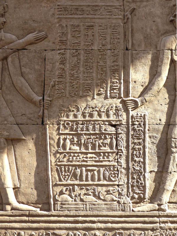 En haut, le roi Philométor offre 2 vases de lait (?) à Panebtaouy suivi d'Hathor qui joue ici le rôle de parèdre d'Haroéris.