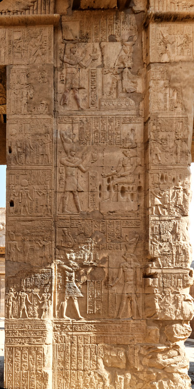 Le pronaos est suivi par une petite salle hypostyle. Si la salle est décorée sous le roi Ptolémée VIII Évergète II, sa face Est constitue la façade des salles suivantes , dénommées ici vestibules, qui ont été décorées et construites sous Ptolémée VI Philometor.