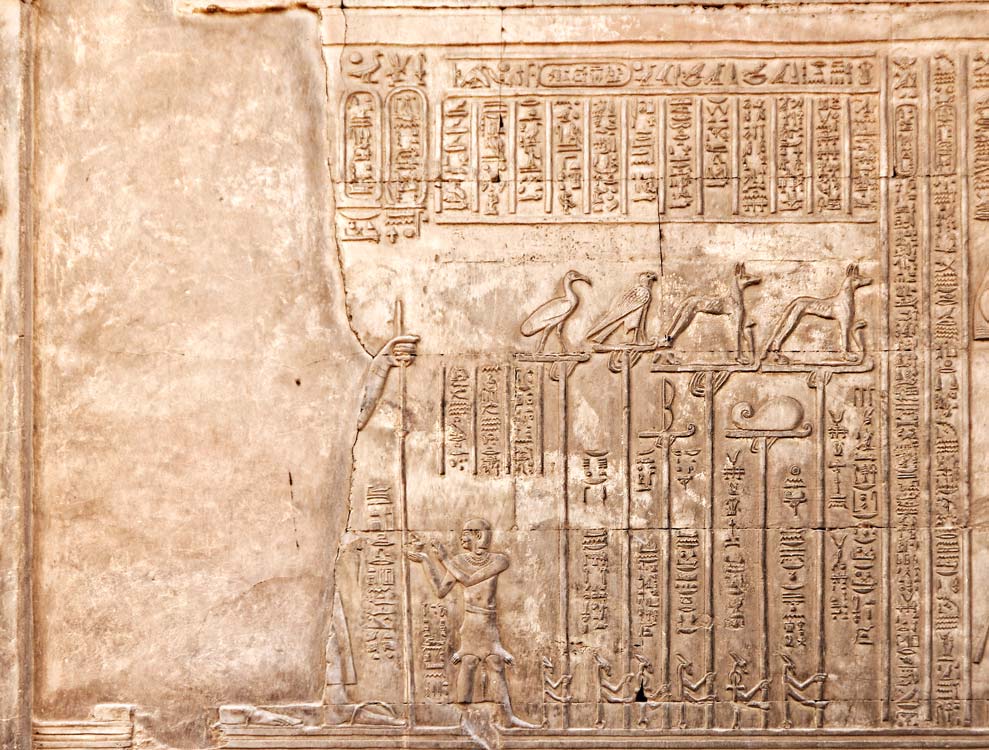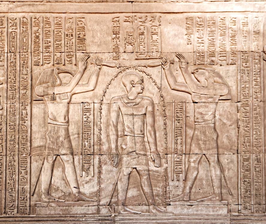 Le roi Ptolémée VIII Évergète est purifié avant d'entrer dans le temple. Il ne porte plus ses sandales, il est dans le monde divin. A gauche, le dieu Thot , maître des écritures et à gauche, Behedety, maître du ciel.