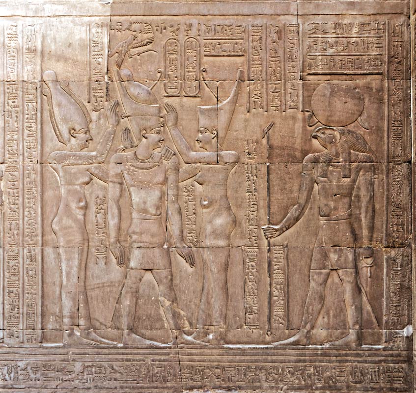 Le roi Ptolémée VIII Évergète est couronné par Nekhbet à gauche et Ouadjet à droite, en présence d'Haroéris. Nekhbet est une déesse vautour protectrice de le Haute Égypte et Ouadjet une déesse cobra, protectrice de la Basse Égypte, toutes deux représentées comme des déesses femmes avec les coiffures représentant leur région.