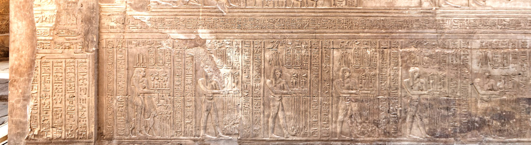 A gauche, le texte sous le jambage Nord de la porte Nord concerne Haroéris. Ensuite commence un défilé de dieux Nil portant des présents