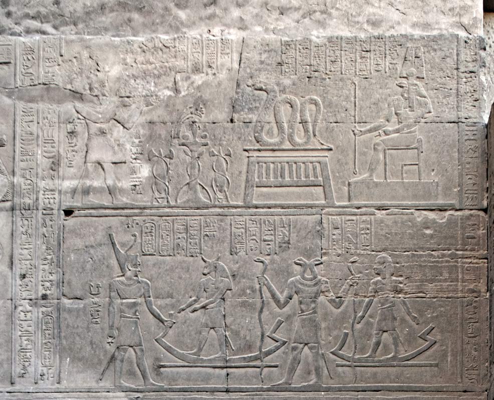 Scène du haut : le roi fait une offrande à un dieu serpent sur un tabouret. Le dieu serpent , dieu bienveillant est Nebtaouy, un des serpents sacrés de Kom Ombo. Derrière lui, le serpent sacré Abech est représenté comme Meresger, déesse protectrice de la nécropole thébaine à qui Hathor peut être assimilée. (Corteggiani, p.323)