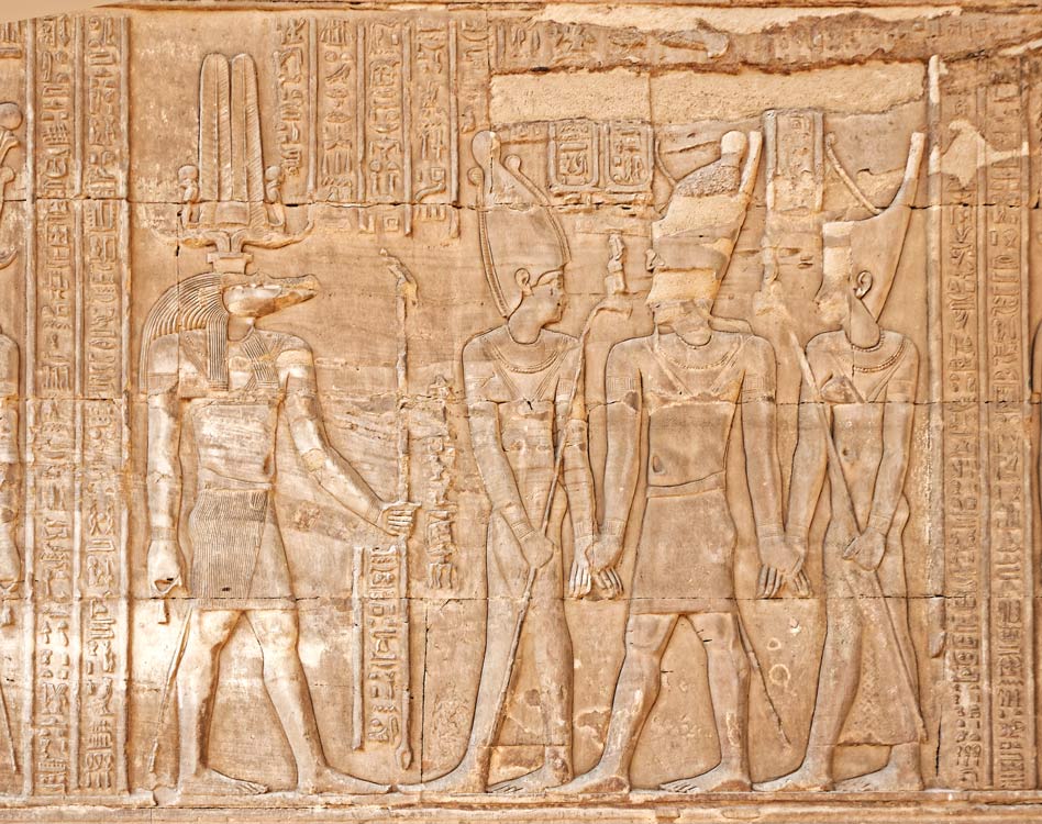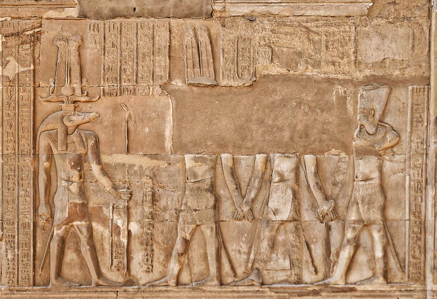 Scène de montée royale au cours de laquelle le roi Ptolémée VIII Évergète II est amené devant Sobek-Rê par Nekhbet et Ouadjet.