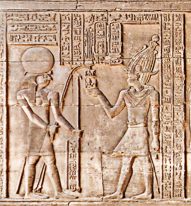 Dans une scène symétrique à celle du registre du haut, le roi Ptolémée VIII Évergète II fait l'offrande du bouquet d'éternité Heh , mais cette fois ci, à Haroéris. qui lui donne en retour des millions de fêtes-Seb.