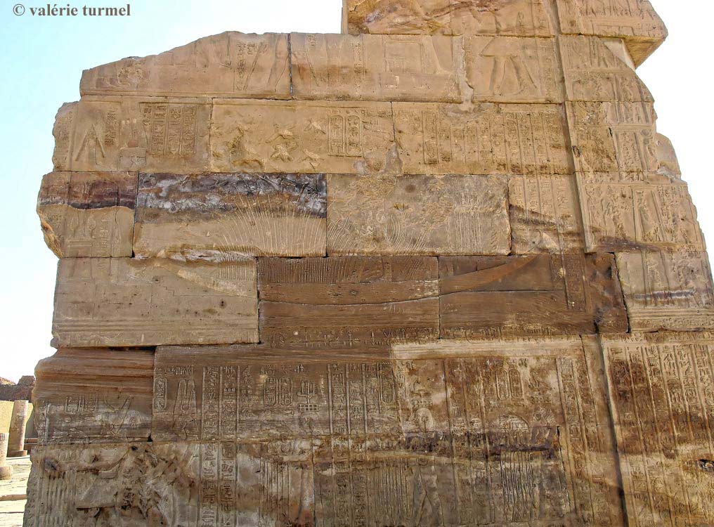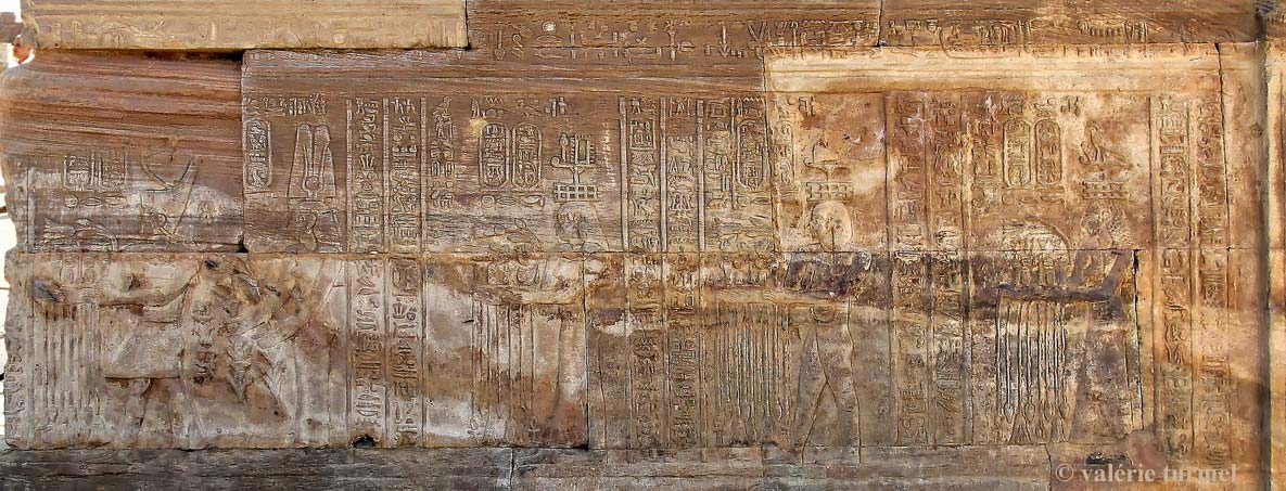 En bas, Haroèris précède le naos avec Renenoutet, déesse des moissons, représentée comme un hippopotame (Corteggiani, p. 467)