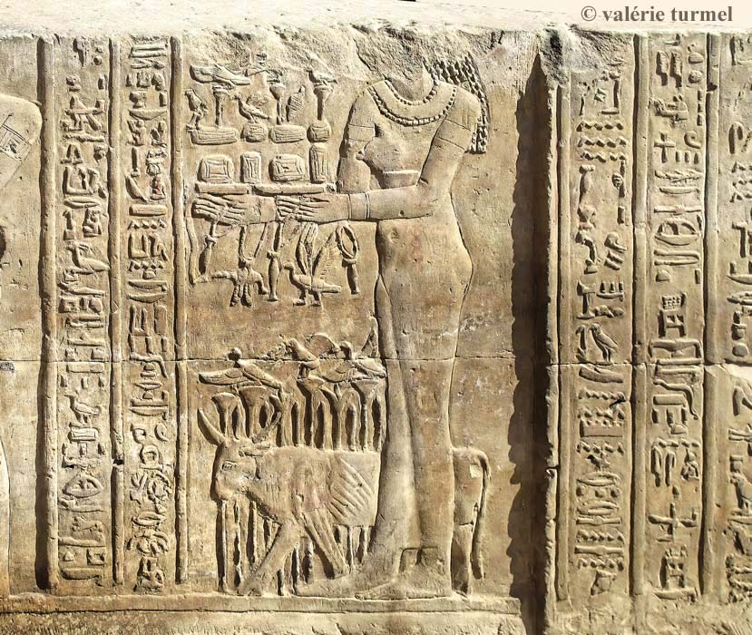 En bas, le roi offre des champs à Sobek suivi d'Hathor en disant : "Donner des champs à son père...".