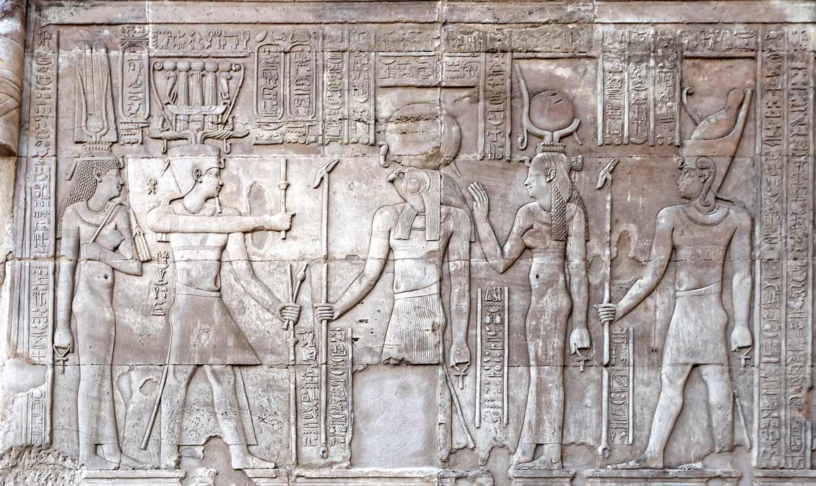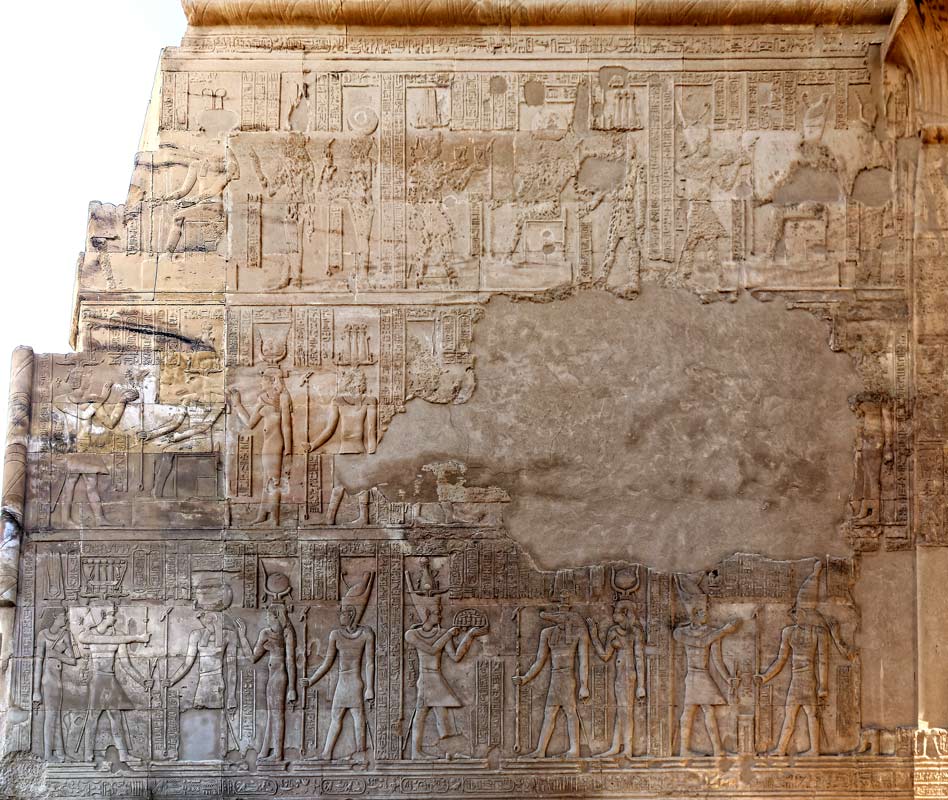 Le roi Ptolémée VIII Évergéte est représenté dans les scènes de cette paroi, façade de la salle hypostyle suivante.