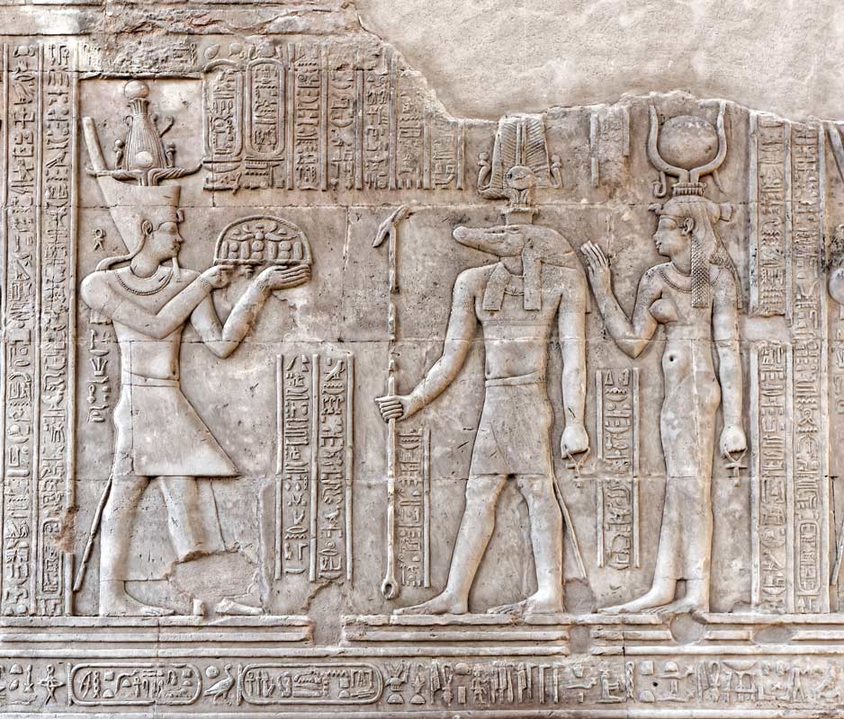 Le roi Ptoléùée VIII offre de la nourriture à Sobek-Rê et Hathor. Derrière le roi, la formule de protection.