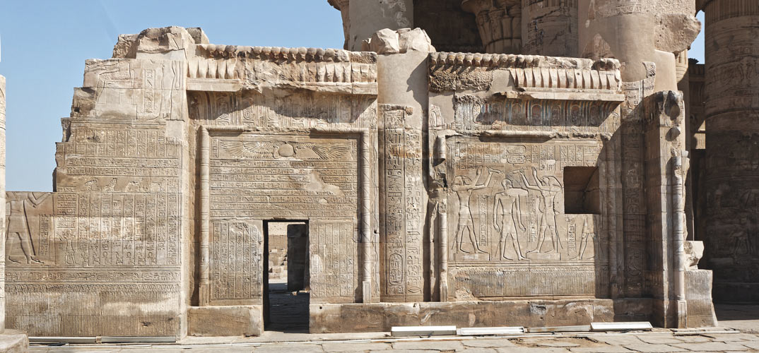 A gauche, une scène montre le roi entrant dans le temple précédé d'enseignes. Au dessus, un reste de scène avec un dieu et une déesse. Le premier panneau contient une porte encadrée de textes ( voir la page spéciale sur les textes des petites portes). Le second panneau montre une scène de purification;