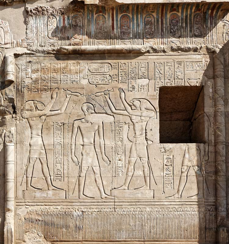 Remarque: d'après Porter et Moss, les scènes représentent Ptolémée XIII d'après l'ancienne numérotation des Ptolémée. La nouvelle numérotation indique que Néos Dionysos est l'attribut de Ptolémée XII et non pas de Ptolémée XIII. ( voir P. Ballet, page 278 et surtout la compilation récente des noms et cartouches K. L. Johnson et B. Petty, 2012). C'est le nom de Ptolémée XII qui sera utilisé dans ce site.
