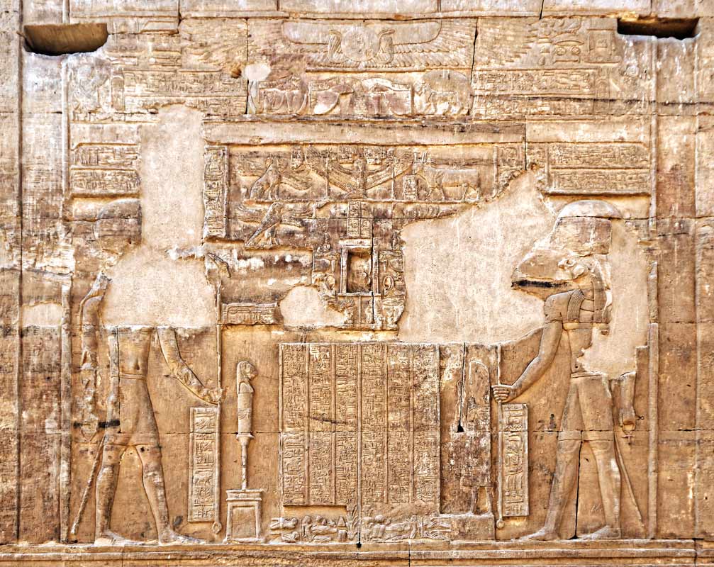Entre les scènes des grands personnages, cette scène a été gravée en haut-relief. Haroéris à droite et Sobek à gauche sont représentés devant leurs armes respectives : l'épée Iyt "Celle qui vient" pour Haroéris et l'épée de victoire pour Sobek. Les dieux sont tournés vers l'axe du temple, contrairement à toutes les règles. Entre eux, est gravé un double hymne, la partie droite dédiée à Are, la partie gauche à Sobek.