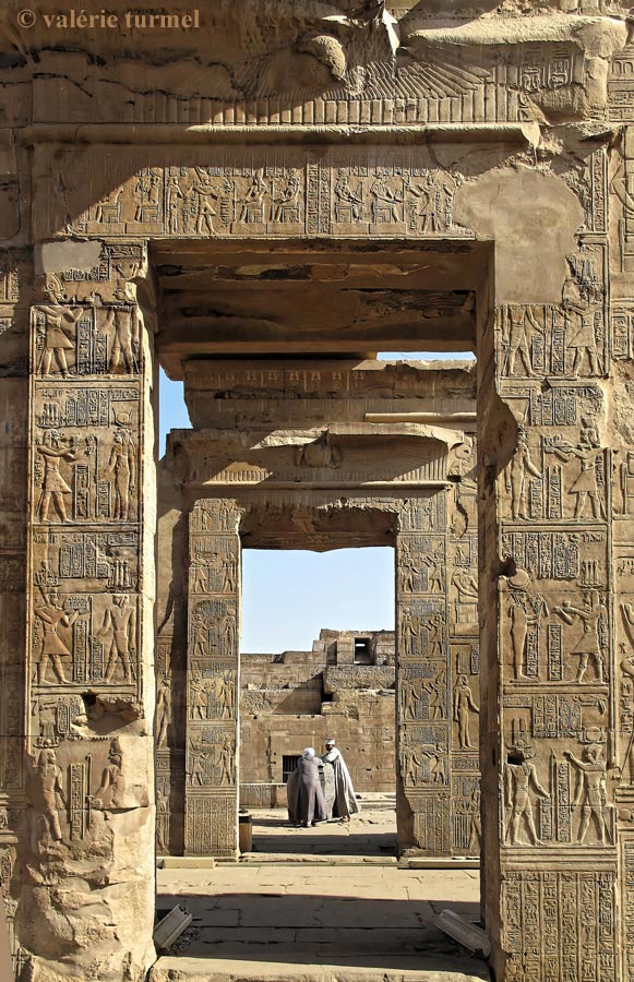 - au milieu : avec Cléopatre II, le roi fait l'offrande de la Maât à Sobek et Hathor.