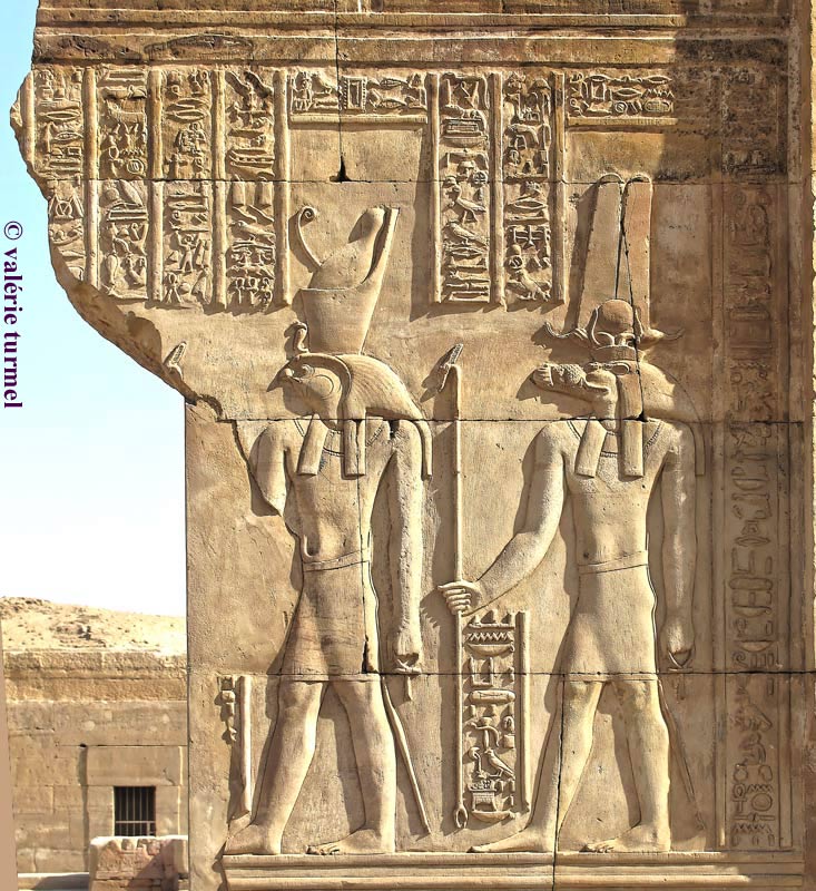 -à gauche : le roi Ptolémée VI offre des fleurs à Haroéris et Khonsou.