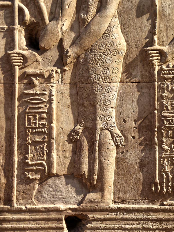 La déesse porte une robe en peau de panthère ou pardalide .Cette peau n'est arborée que par quelques prêtres et par peu de dieux : Harendotès et Iounmoutef.