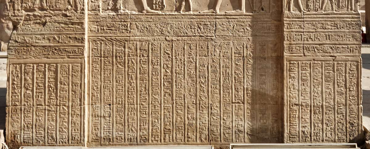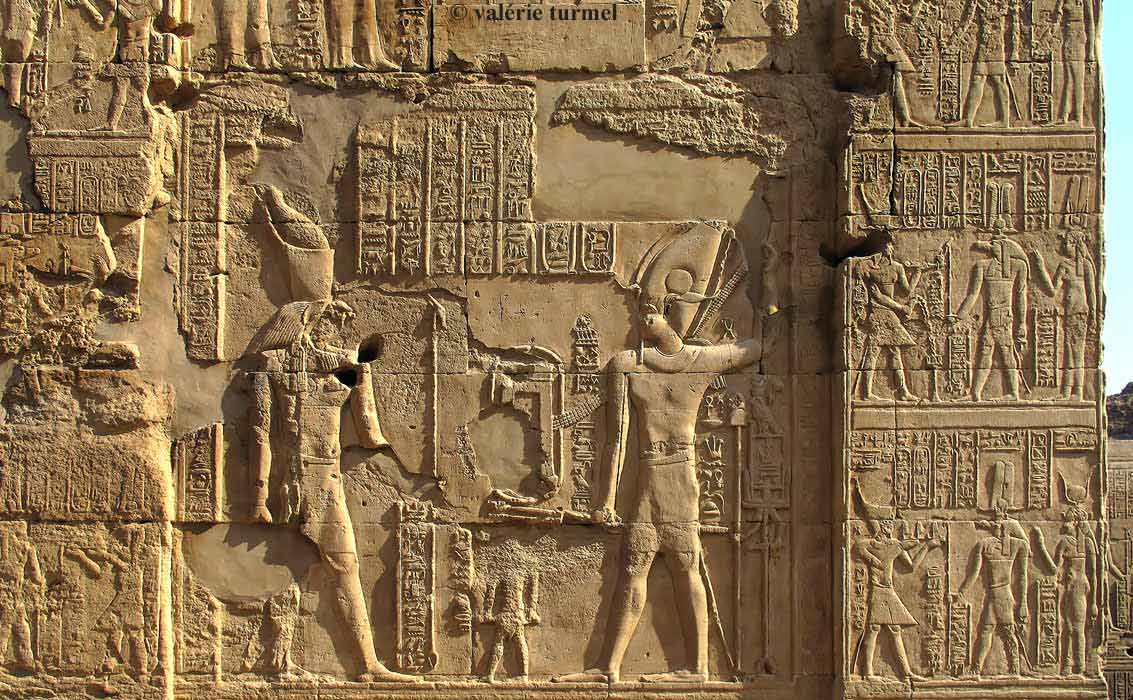 demeureront en paix, créant leur fils Osiris à nouveau. 'Isis et Nephtys y seront en joie.' ainsi que le fils d'Isis pour venger son père. Le texte comporte les noms du temple: 'la Maison du Crocodile, le Palais..la Maison du Faucon' ainsi que des sanctuaires : 'le grand Palais' pour Haroéris et 'le Château des formes' pour Sobek'. Le texte énumère la liste des dieux qui se trouvent dans le temple et tous les éléments sacrés. Le nom du serpent divin est Abech.