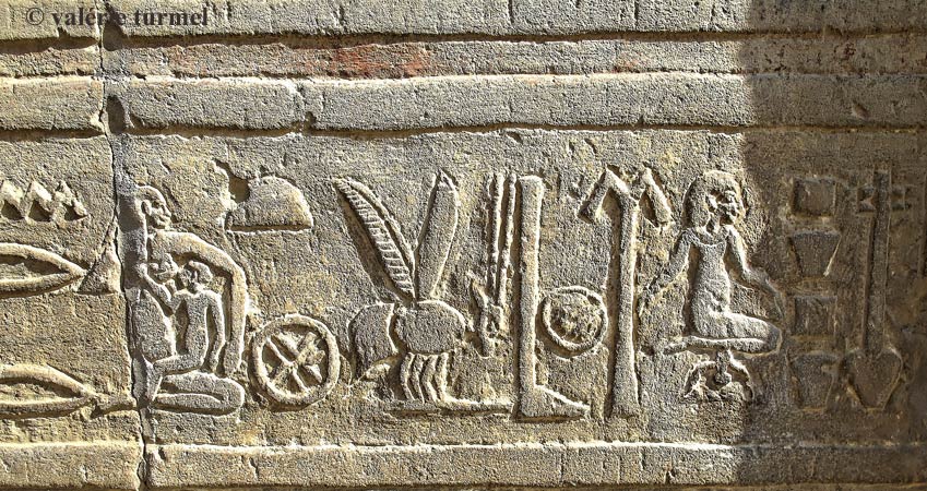 A droite, le hiéroglyphe de l'accoucvhement et à gauche, celui de l'allaitement.