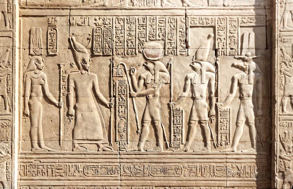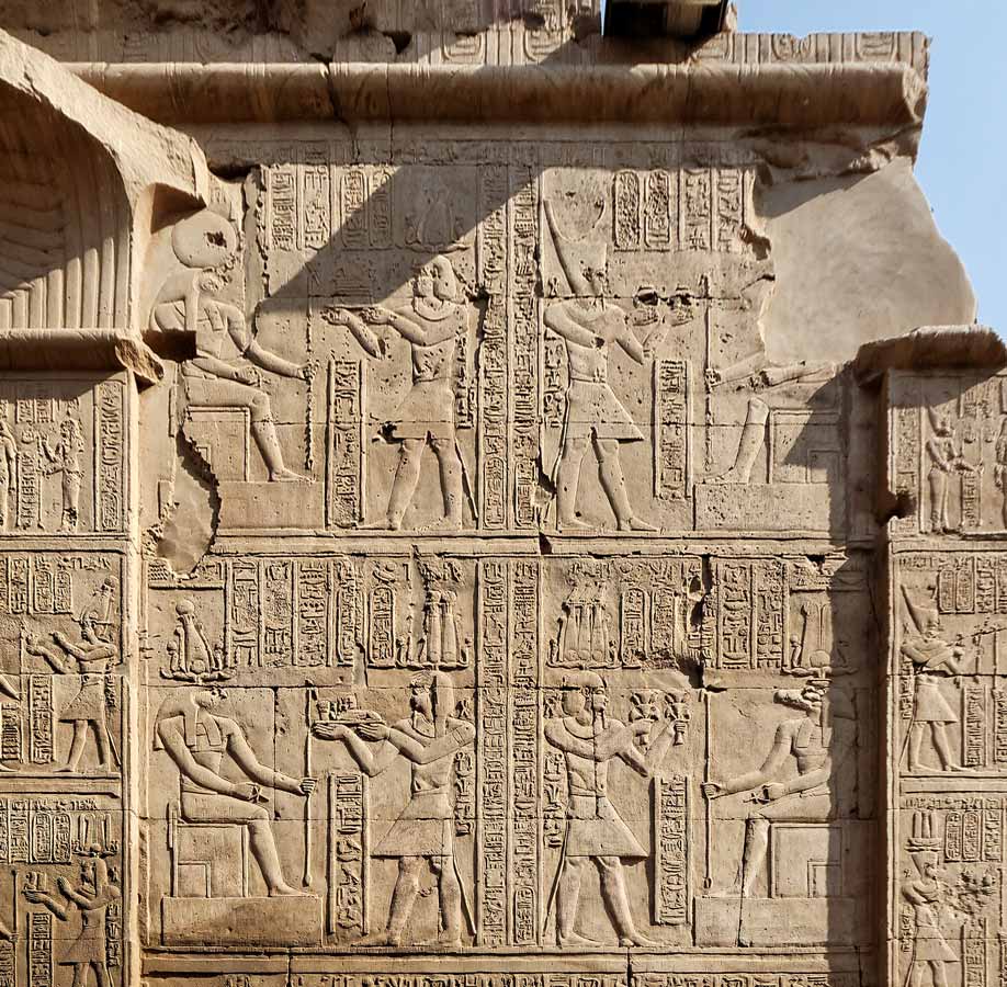 Devant lui, Khonsou est représenté avec une tête de faucon : il écrit sur une canne tenant des fêtes-Seb. Il est suivi par Haroéris et Sobek-Rê. En dessous, une ligne de texte dédicatoire pour le roi, avec 2 hiéroglyphes très particuliers..