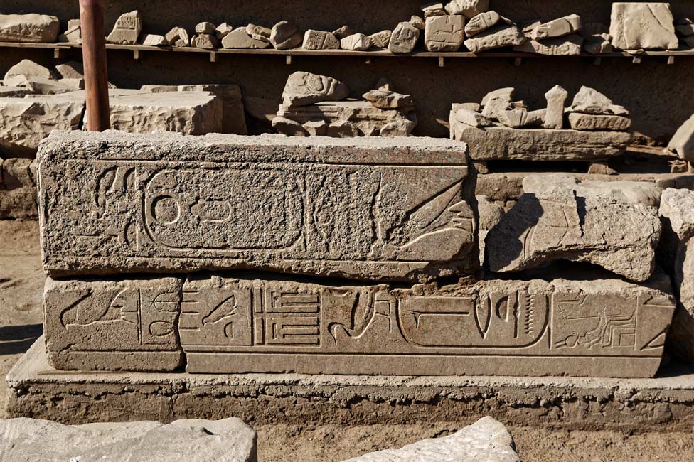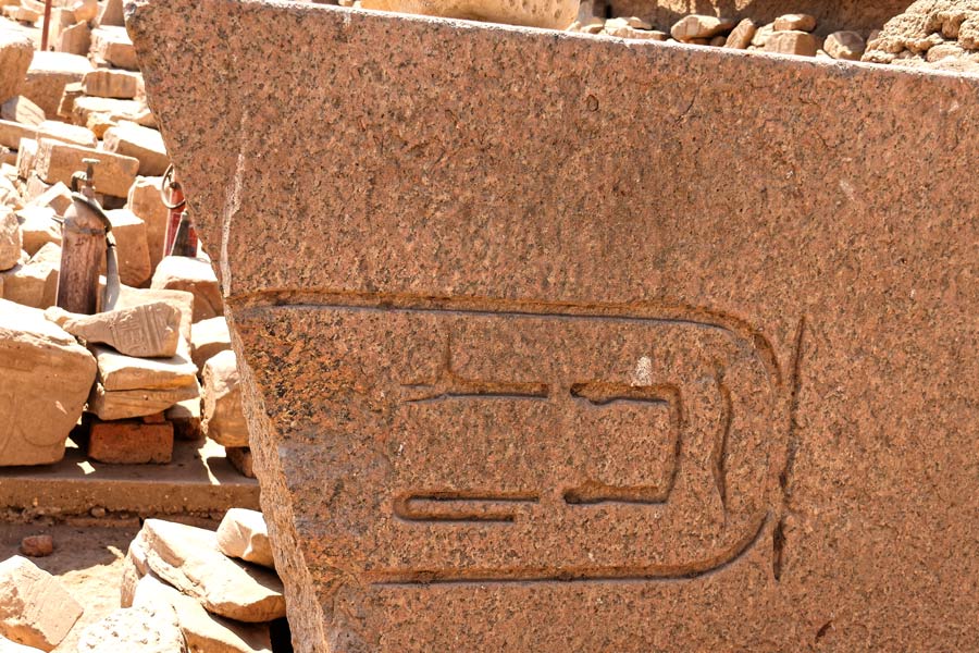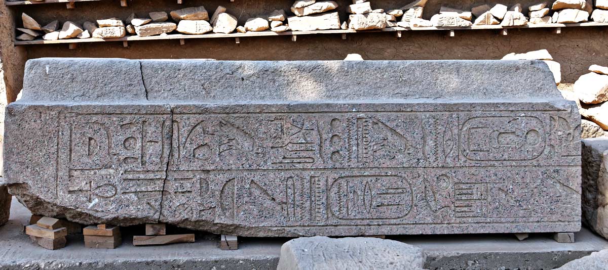 Il s'agit du montant gauche de la porte en granit de Sésostris 1er. On y reconnaît les deux cartouches de Sesostris 1er : en haut, à droite, <Kheper-Ka-Rê> Le Ka de Rê est advenu. . En bas ,<Se-Ouseret>, l'Homme de la puissante. Sesostris indique qu'il a érigé une porte comme offrande. Dans la 2ème ligne, il est dit 'aimé de Montou, maître du ciel'. Montou est considéré comme un dieu universel.
