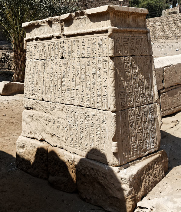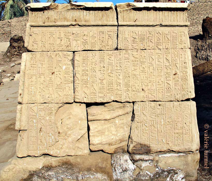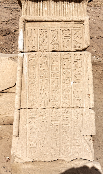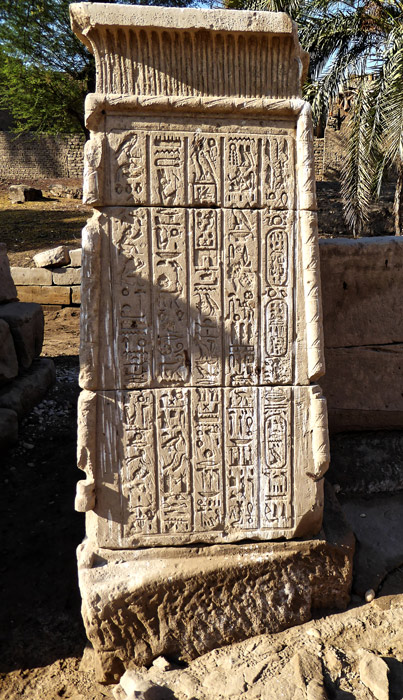 Dans son rapport des fouilles publié en 1941, Bisson de la Roque a publié le relevé en hiéroglyphes et la traduction du texte du petit pylône Nord, qu'il appelle un autel (p.37 à 42).. Le texte commence sur la face Sud, vue de gauche, à la 3ème colonne en partant de la droite. Sur la 2ème colonne, en partant de la droite, les signes sont tracés dans l'autre sens : il s'agit de la 4ème partie du texte dont la 6ème partie se trouve à la colonne de gauche de la face Est (vue de droite) et ainsi de suite jusqu'à la dernière colonne qui constitue la 24ème partie du texte relevé.