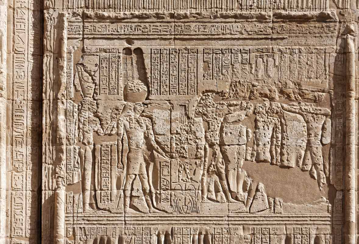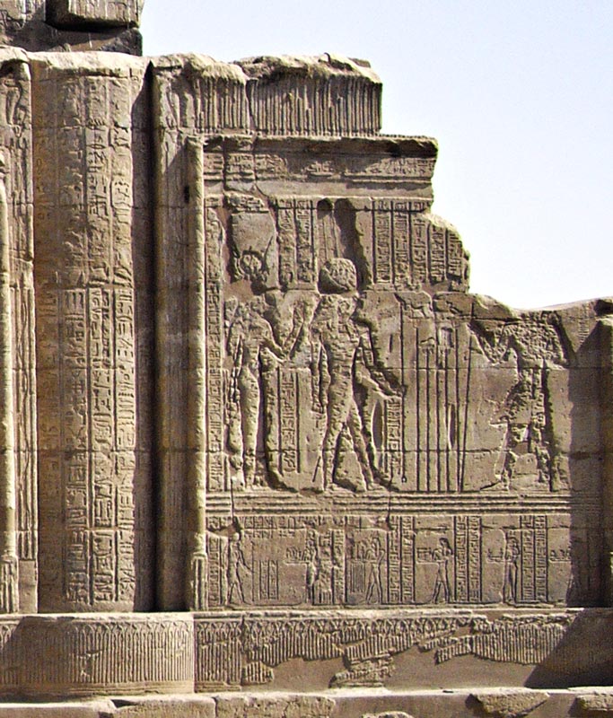 Le roi conduit à Montou un défilé de 2 personnages : un dieu Nil de Haute Égypte et une belle Campagne.