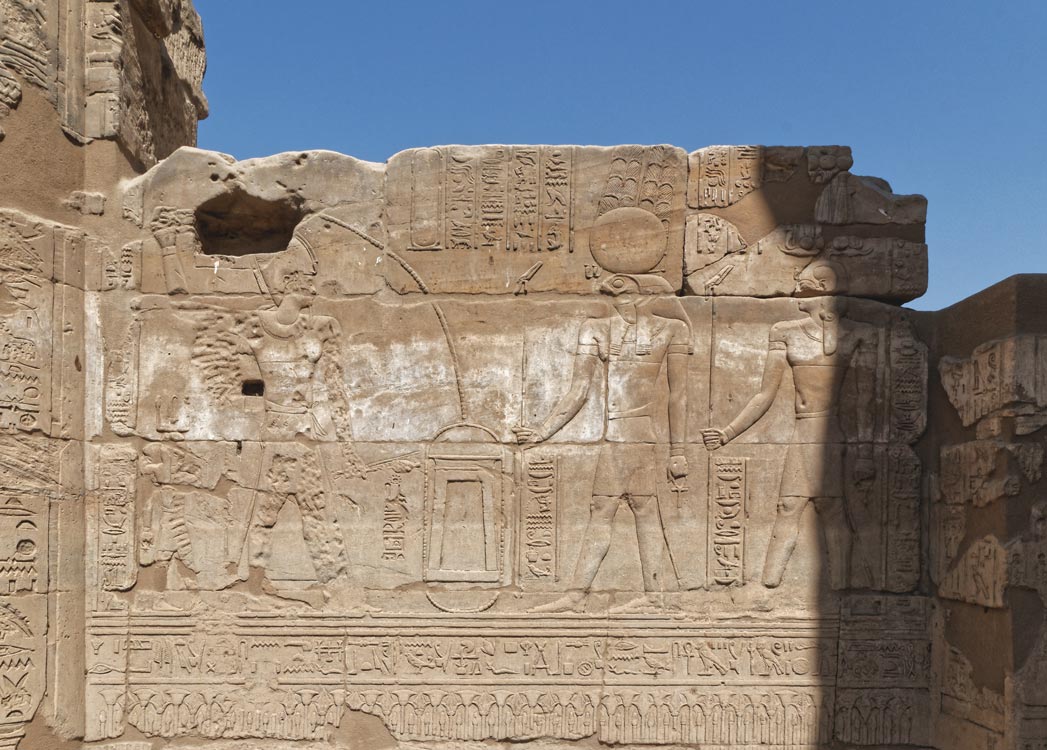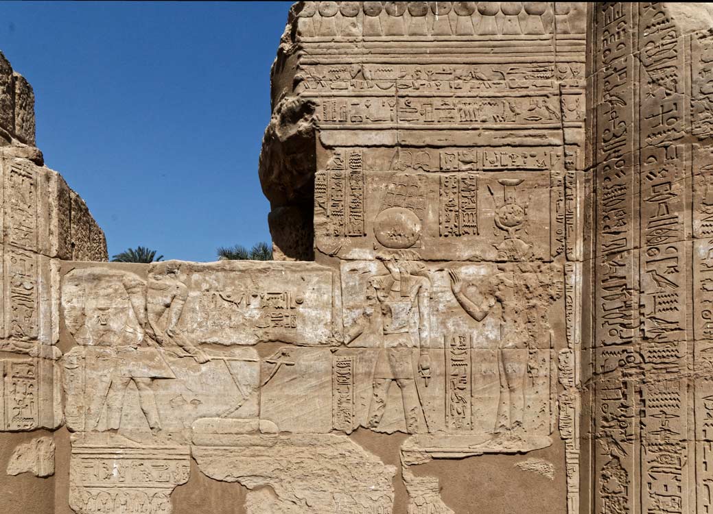 Deuxième épisode de la fondation du temple : le roi creuse la tranchée pour atteindre la nappe phréatique, retrouver l'eau primordiale et déterminer l'horizontale. Devant lui, Montou est suivi de Rattaouy. Ce 2ème épisode se trouve de l'autre côté de la porte par rapport au premier.