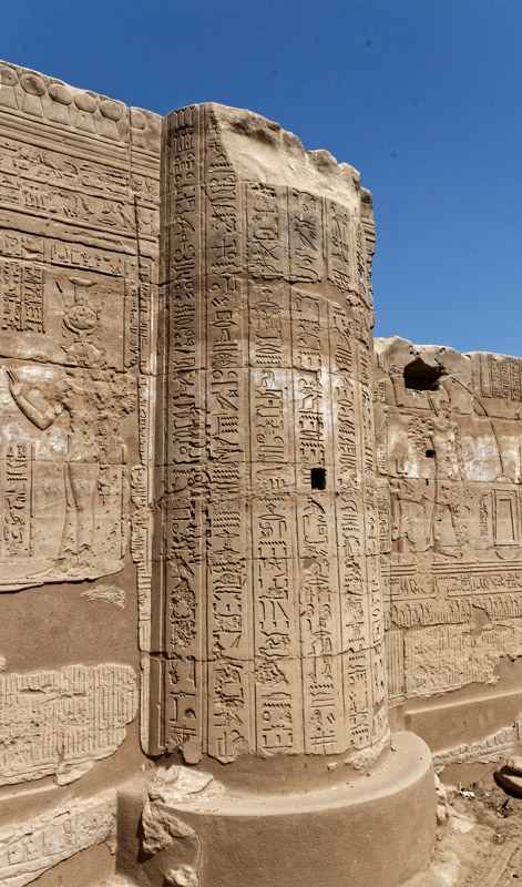 La colonne engagée entre les scènes comporte un texte dont la traduction complète est donnée par Christophe Thiers (Bifao 104, 2004, p.561). Ce texte donne des dates de célébration de Montou à Tôd. La première date est le premier de l'an, après "qu'il ait allumé la torche issue des 2 yeux du ciel". De nombreuses épithètes lui sont données : "Âme impétueuse.. taureau aux cornes acérées..au coeur puissant..le jeune enfant, le champion muni de ses armes..". Il y est dit aussi que " le bruit de ses cris est entendu jusqu'aux limites de l'univers afin de chasser au loin celui qui s'est écarté de lui" "il fait de nombreux massacres.. avant de les piétiner".