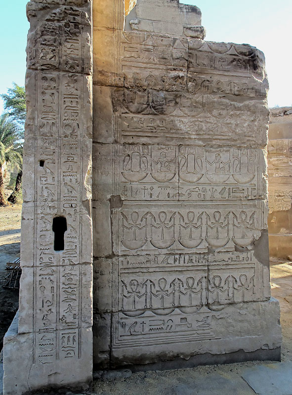 Sur une autre ligne, successions de signes Ouas soutenus par des signes Ankh. La corbeille en dessous des signes signifie 'tout'.