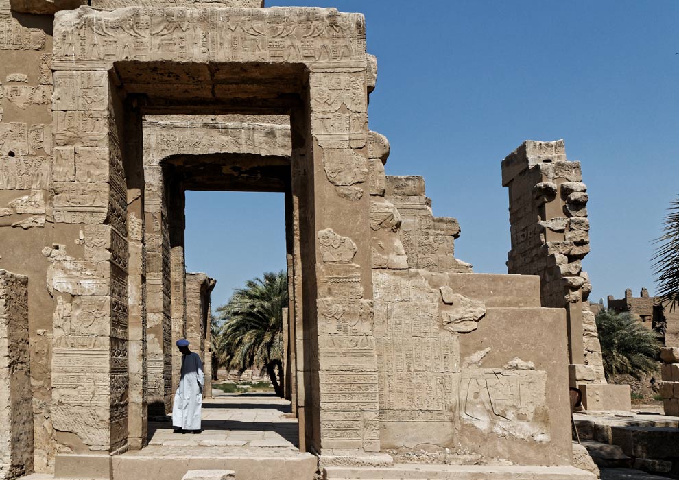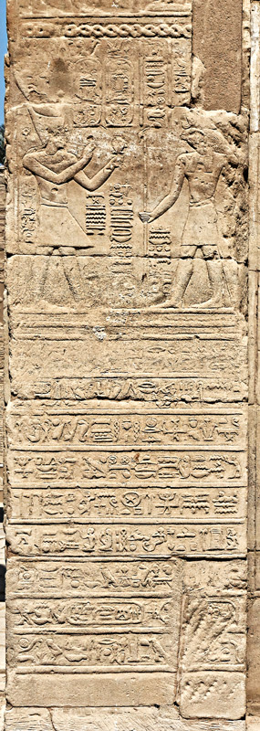 Le roi Ptolémée VIII Évergéte II offre un bouquet à Montou-Rê et à Tanent-Rattaouy. Entre le roi et les dieux, les dieux maîtres d'autel Ageb-Our et Apis préparent les offrandes : La formule de protection est inscrite dans les 2 scènes.