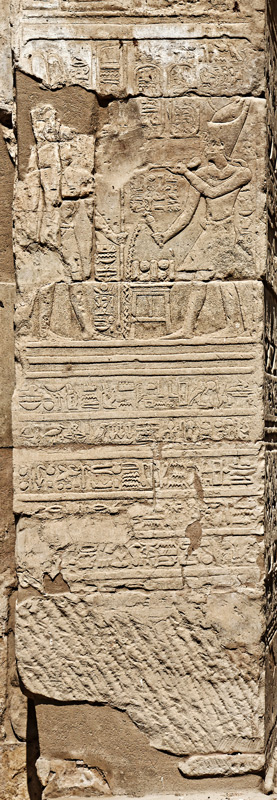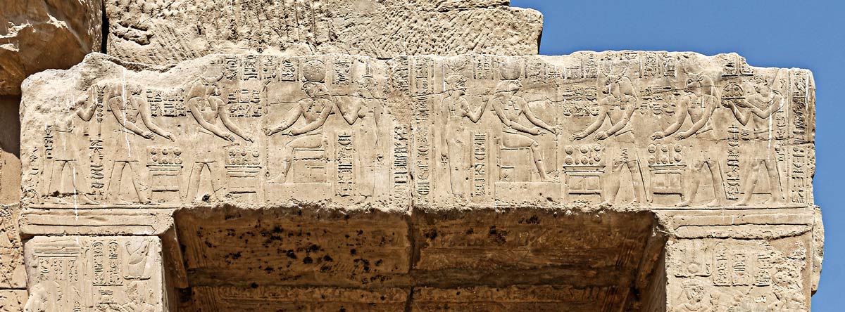 Le roi Ptolémée VIII Évergéte II fait une grande offrande de nourriture à Montou-Rê et à Rattaouy. Entre le roi et les dieux, les dieux maîtres d'autel Sema-Our et Mnevis préparent les offrandes :