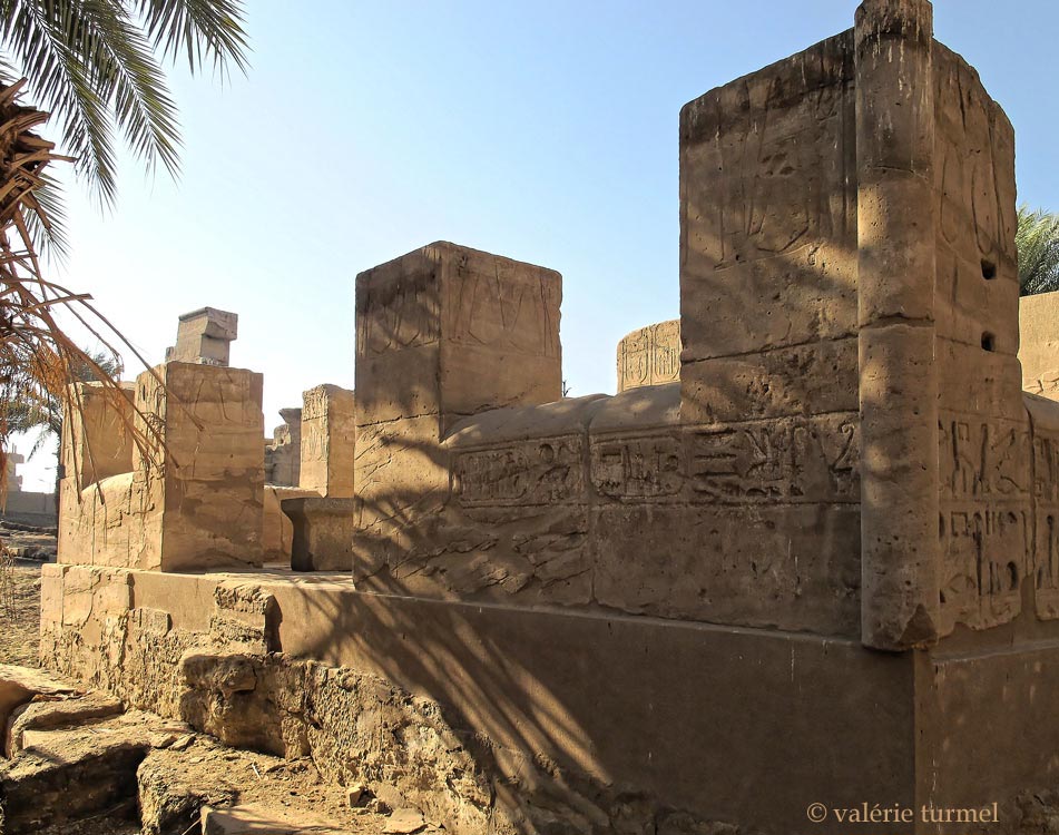 L'entrée Nord du reposoir comportait également une rampe aujourd'hui disparue. A droite, sur le mur bahut est inscrite la fin de la 1ère ligne d'un texte de Ramsès III (voir la page dur la façade Ouest). Il n'y a pas d'autres textes sur cette entrée dont seulement les piliers comportent des scènes du roi avec une divinité.