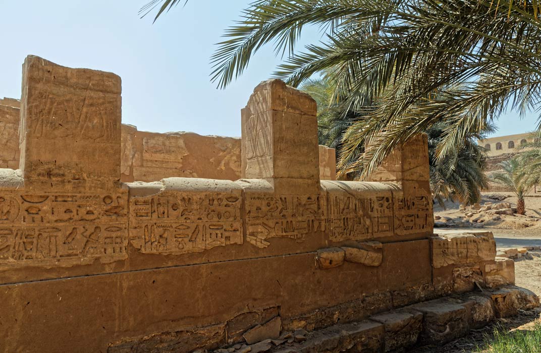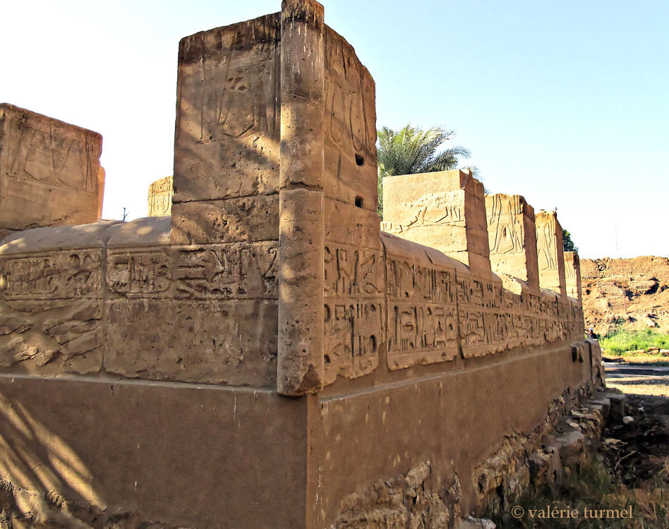 Ramsès III fit graver un grand texte sur cette façade. Il commençait sur le mur bahut Ouest de l'entrée Sud, maintenant disparu. Il se termine sur le mur-bahut Ouest de l'entrée Nord. Il occupe deux lignes le long de la paroi. La traduction complète peut en être trouvé dans Barguet (1952, p.100 et 101)..