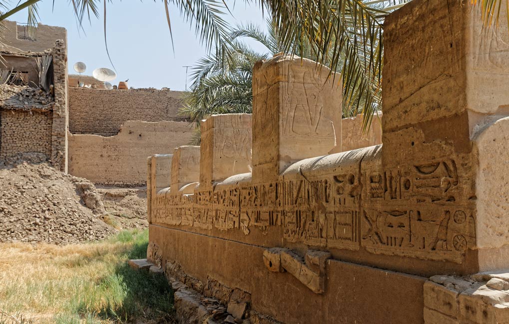 Sur les faces tournées vers l'intérieur du temple, , les scènes sont gravées en vrai relief comme il est d'usage. Des restes de peinture, notamment rouge subsistent.