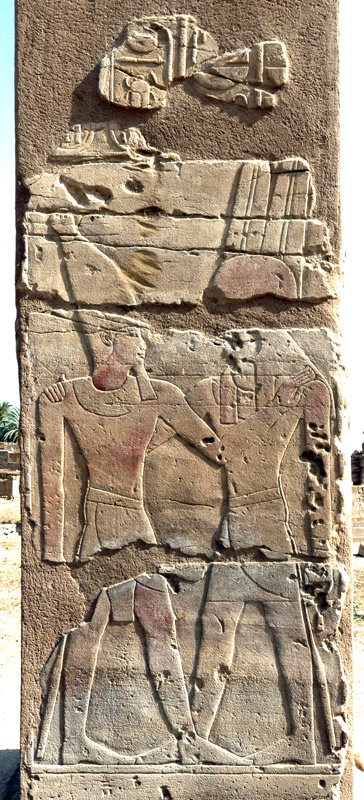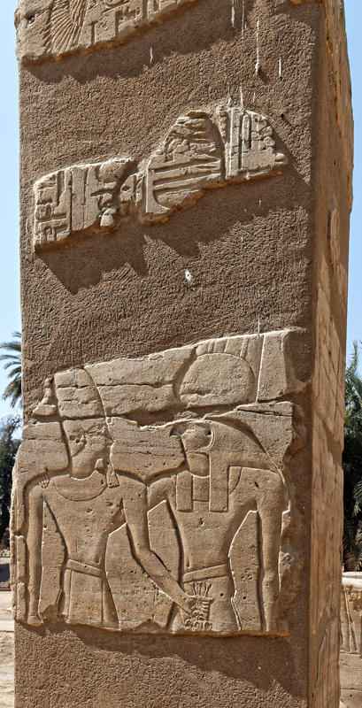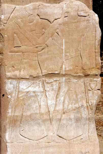Face Sud : le 3ème pilier a pu être reconstitué en partie. Montou donne l'accolade au roi tourné vers l'intérieur du temple. les reliefs sont dans le creux..